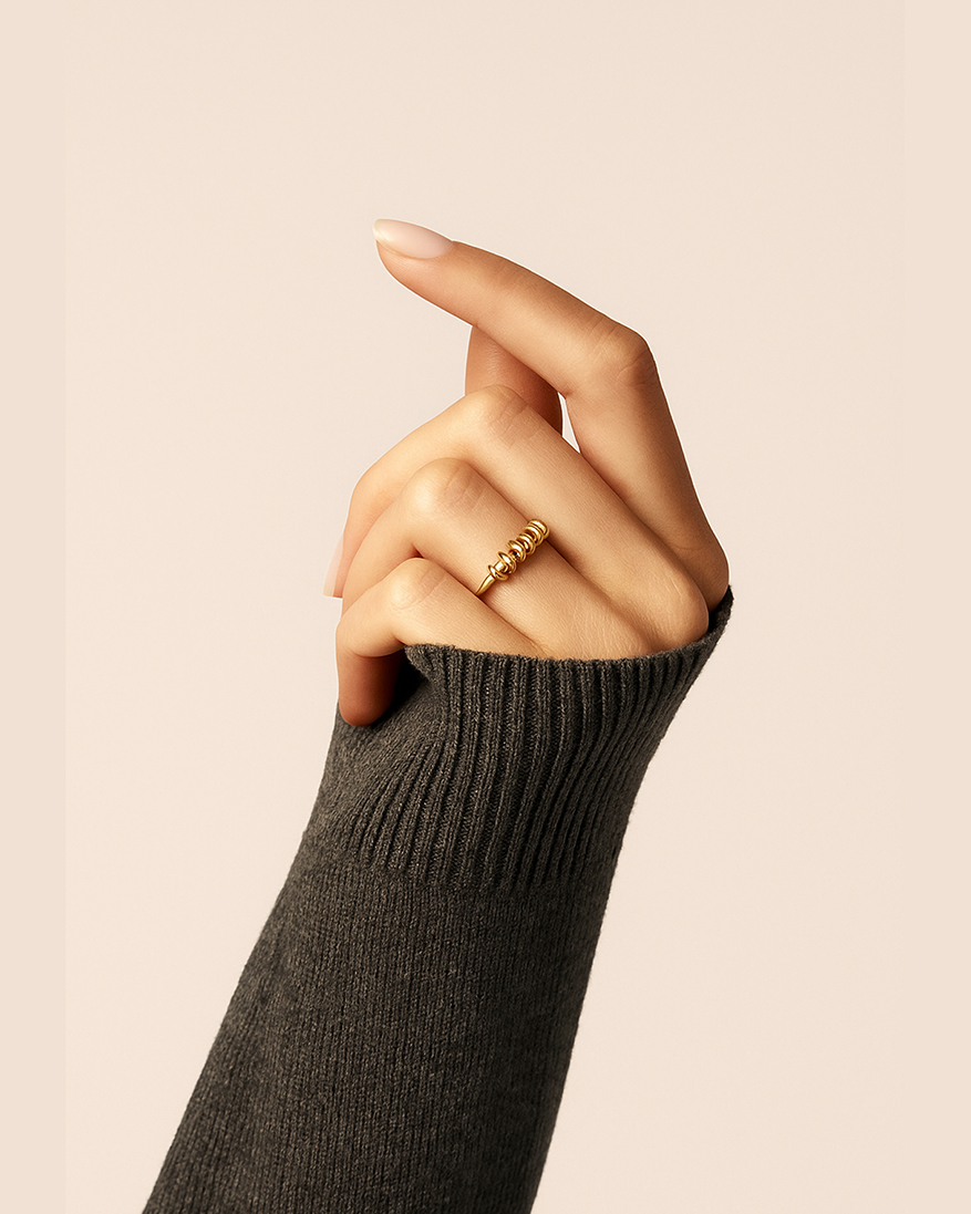 طراحی این مدل از حرکت و تعادل الهام گرفته شده است. حلقه‌های درهم، نماد بی‌پایانی و پویایی‌اند — انگشتری که در عین سادگی، بیانگر انرژی و ظرافت است.