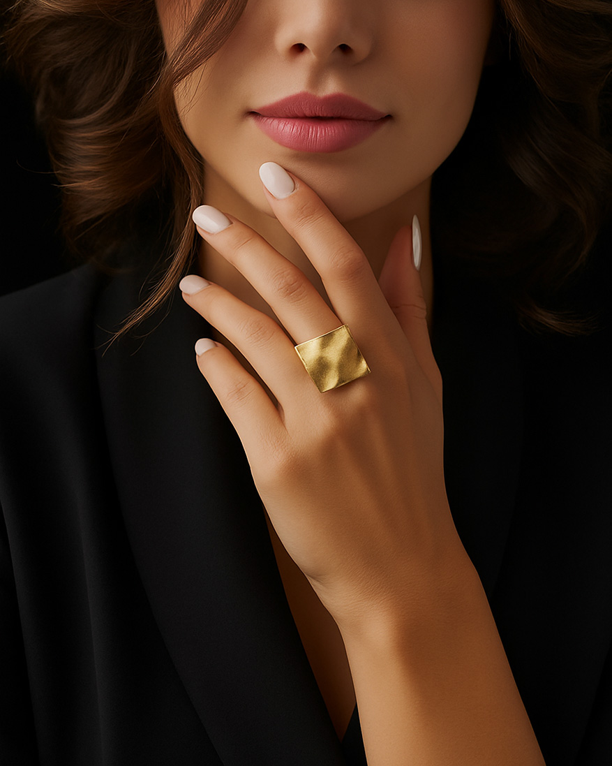 سطح چکشی این انگشتر، حس بی‌نقصی در سادگی را تداعی می‌کند. هر بازتاب نور روی آن، نشانی از ظرافت و اصالت در طراحی مدرن طلاست.