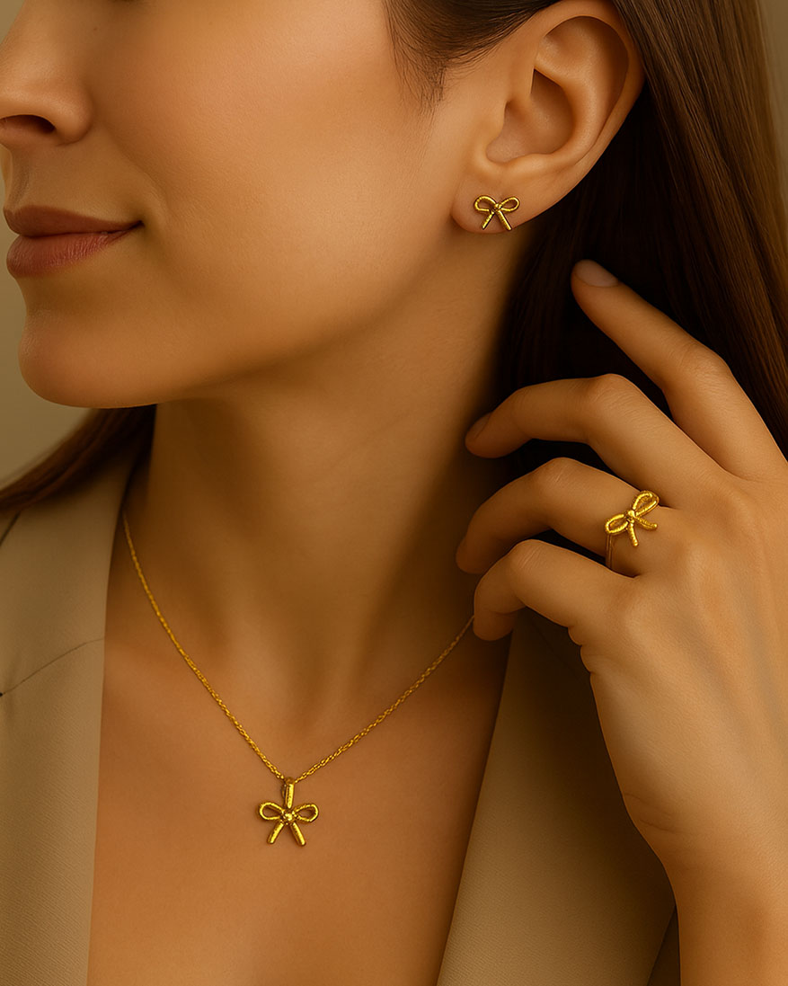 طرح پاپیونی این نیم‌ست با خطوط منحنی و تراش‌های ظریف، احساس لطافت و درخشندگی را هم‌زمان ایجاد می‌کند. جلوه‌ی مینیمال و دوست‌داشتنی آن باعث شده در دسته‌ی طلاهای کادویی نیز بسیار محبوب باشد.